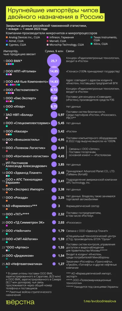Чипы двойного назначения в Россию возят сотни компаний. «Вёрстка» составила список крупнейших импортёров этих компонентов. Из 25 крупнейших импортёров, как мы смогли установить, 11 — прямые поставщики предприятий ВПК, в том числе первые пять крупнейших.