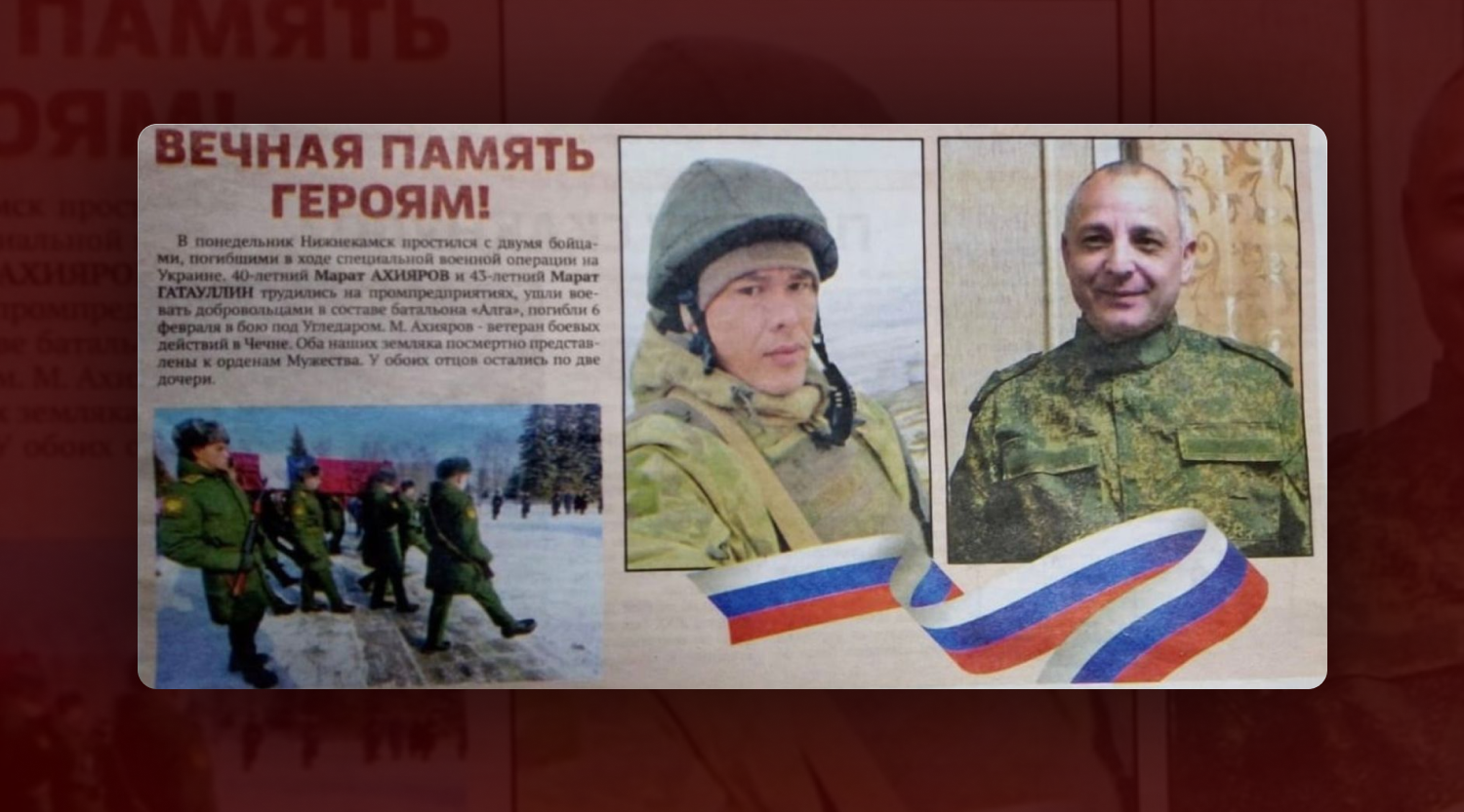 В первые недели февраля "Idel.Реалии" фиксировали множество сообщений о погибших российских солдатах под Угледаром, однако на тот момент удалось обнаружить лишь одного уроженца Татарстана из батальона "Алга" — Марата Ахиярова. Спустя пять месяцев в нашем списке 24 имени.