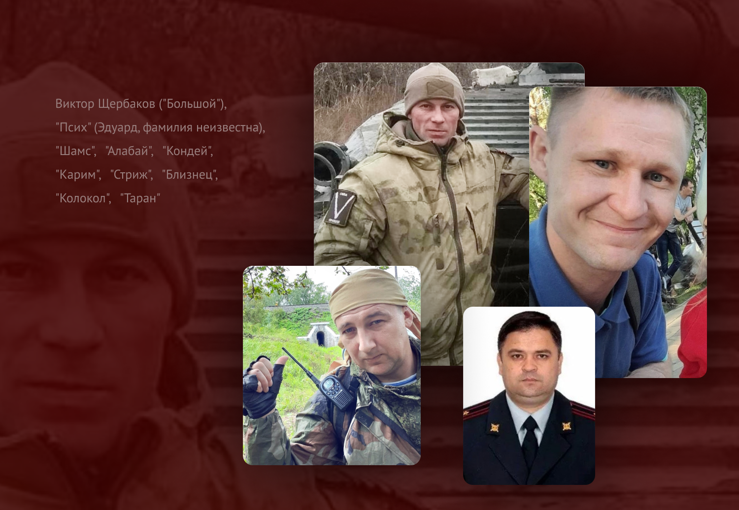 Ильназ поделился с "Idel.Реалии" несколькими именами и позывными погибших на том самом поле под Угледаром: "Псих" (Эдуард, фамилия неизвестна, вторая рота, родом из Екатеринбурга), "Алабай", "Большой" (Виктор Щербаков, вторая рота). О других солдатах и их позывных стало известно из соцсетей: "Шамс", "Кондей", "Карим", "Стриж", "Колокол", "Таран", "Близнец".