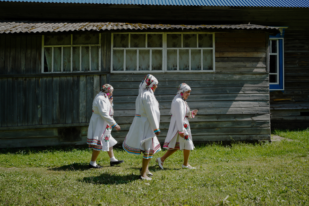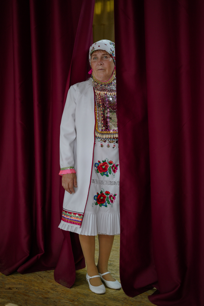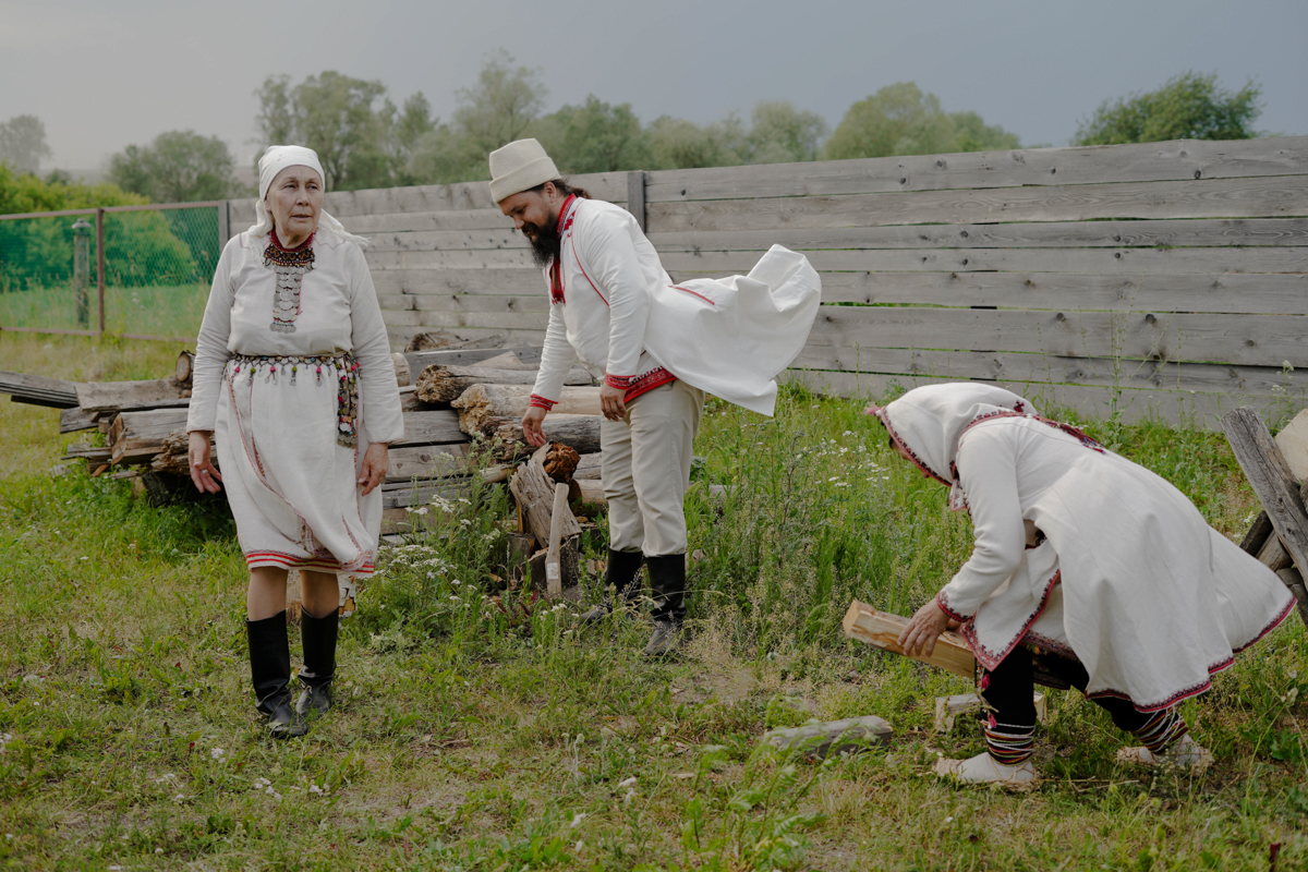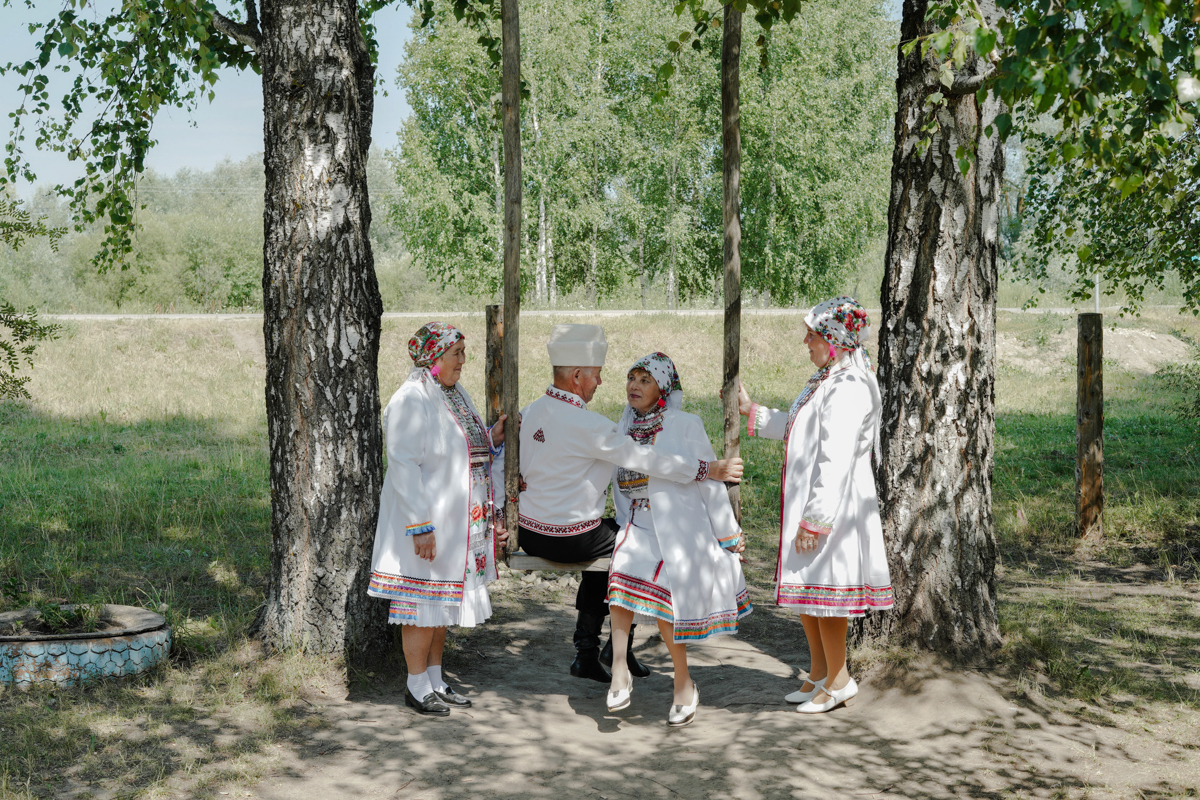 Марийский народный фольклорный ансамбль «Эр кече» возле шланьского сельского клуба, Марий Эл. Ансамбль ездит на гастроли. У них растет замена: детский ансамбль, там шестеро мальчиков и шесть девочек. Перед выступлением участники ансамбля посыпают голову солью: чтоб не сглазили