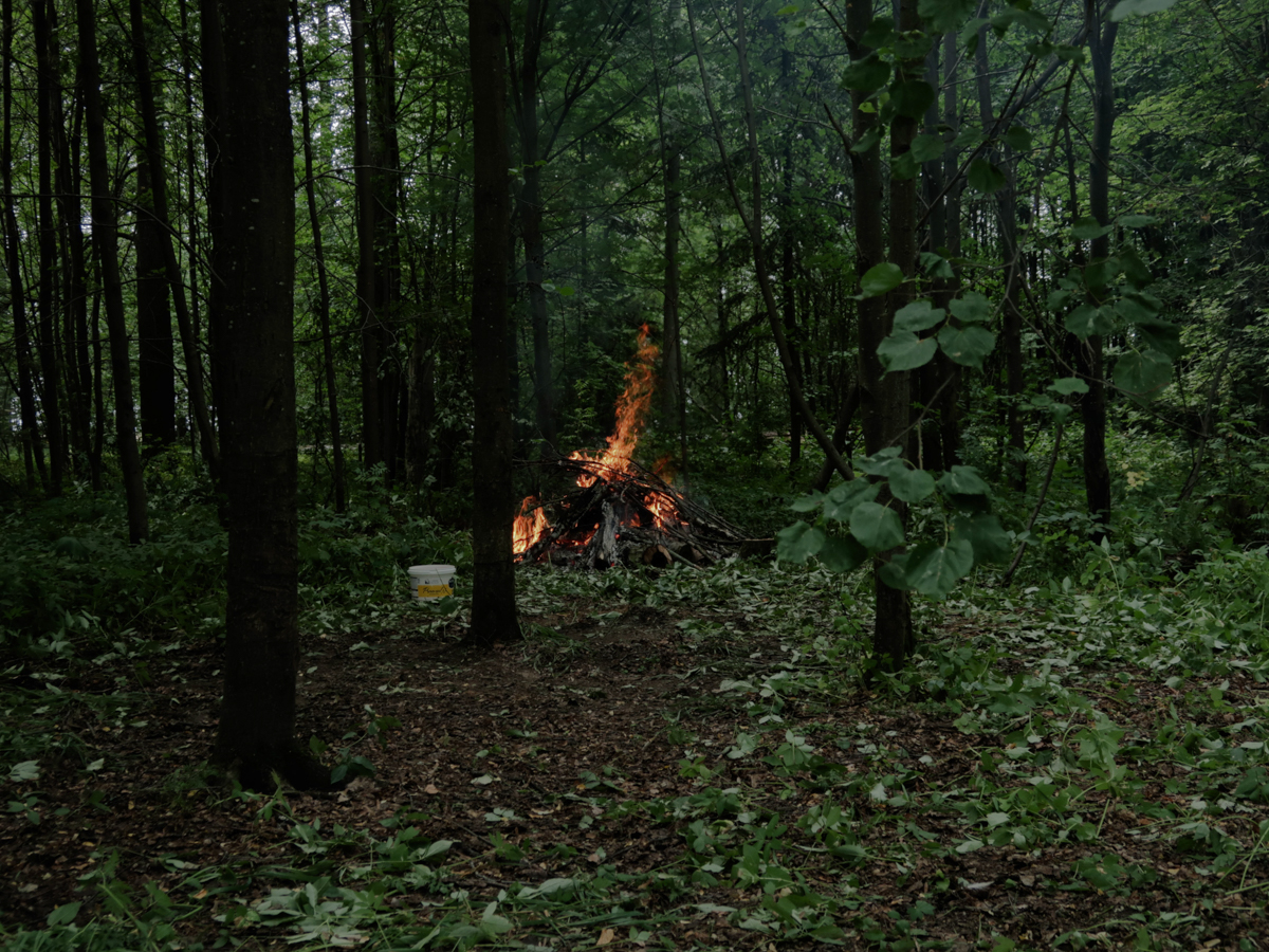 Кострище в священной роще села Шоруньжа на коллективных молениях Сурем. Кострище с костром — одно из святых мест в молельной роще — является особым очищающим местом