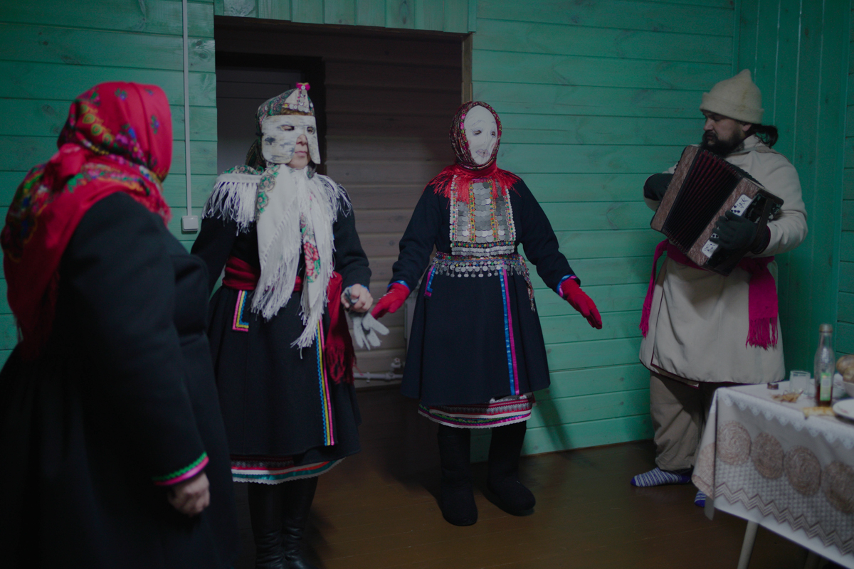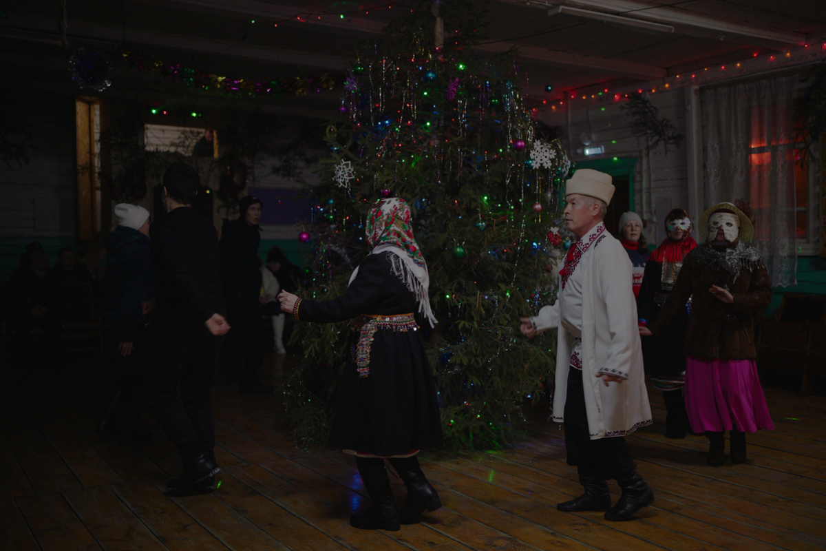 Ряженые танцуют и поют в доме одной из жительниц села Шлань на праздновании марийского Нового года Шорыкйол