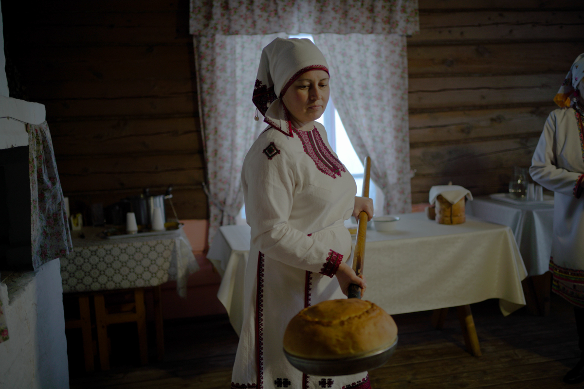 Одна из работниц этнокультурного комплекса в селе Шлань подает на стол свежеиспеченный хлеб