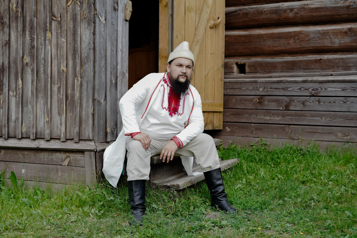 Алексей сидит на ступеньках у входа в Музей марийской культуры, село Шоруньжа, Марий Эл