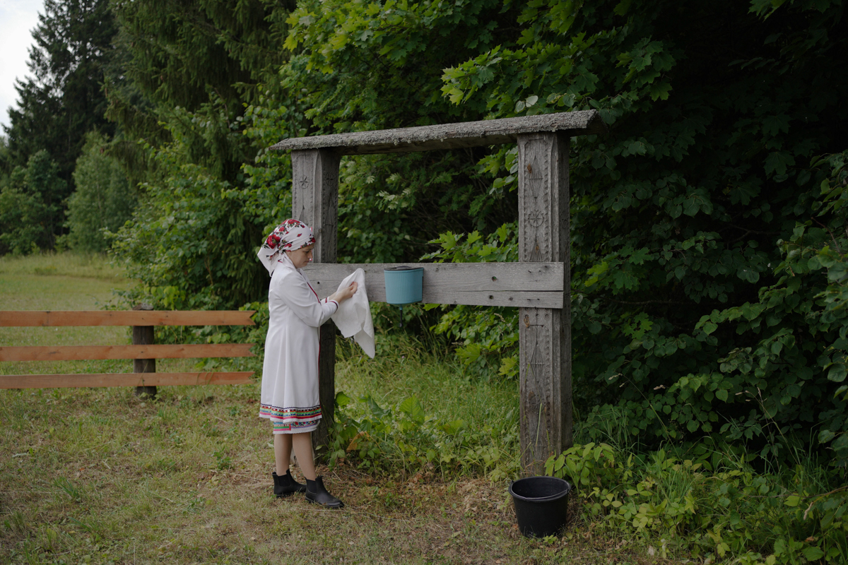 Одна из жительниц села Шоруньжа споласкивает руки перед входом в священную рощу на коллективное моление Сурем