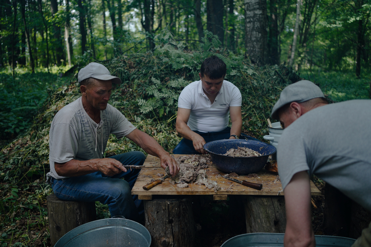 Мужчины подготавливают мясо для варки во время коллективного моления Сурем в священной роще села Шоруньжа