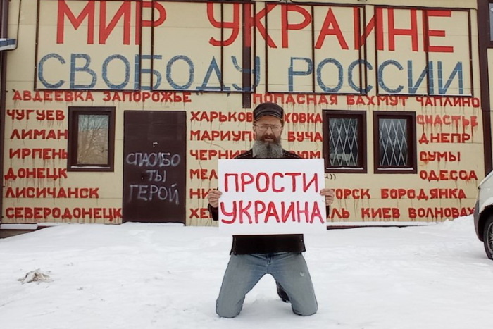 Еще один плакат с фразой "Прости, Украина" Скурихин сделал к годовщине начала военных действий России в Украине. Дочь Скурихина Ульяна сфотографировала, как ее отец стоит на коленях с этим плакатом возле своего магазина, и отправила фотографию журналистам.