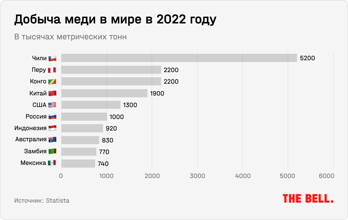 Стоит отметить и геополитический фактор. Из 20 млн тонн меди, произведенной в 2020 году, более половины пришлось на страны, которые отнесены к категории «нестабильных» или «чрезвычайно нестабильных». Например, вторым по величине ее добытчиком является Перу (лидер Чили — 24% мирового производства), где уже год бушуют протесты из-за ареста и импичмента президента Педро Кастильо. Несмотря на то, что производительность после этого снизилась, Reuters сообщает, что в 2023 году правительство Перу рассчитывает увеличить добычу меди на 15% год к году — до 2,8 млн тонн.