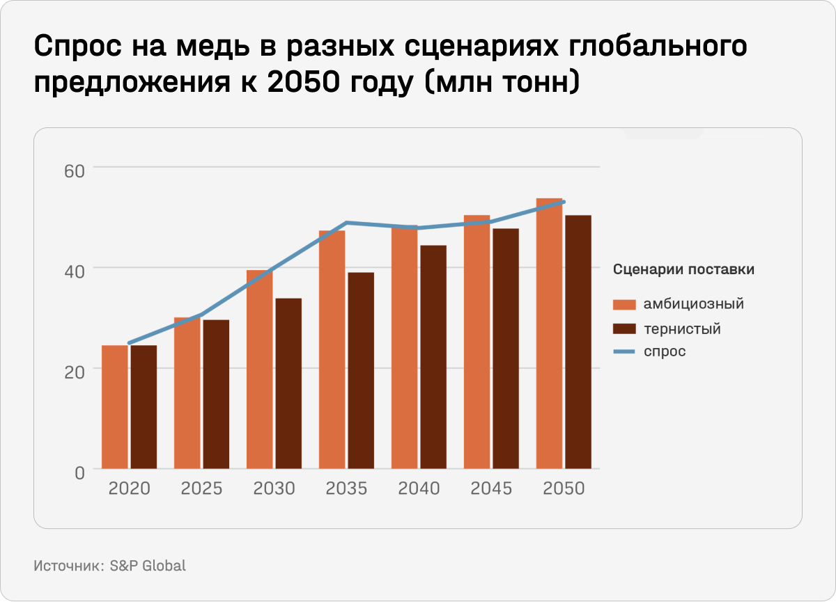S&P Global Market Intelligence прогнозирует, что к 2035 году спрос на медь удвоится и составит 50 млн тонн на мировом рынке. В отчете также сказано, что, согласно базовому сценарию, годовой дефицит к этому моменту достигнет 1,5 млн тонн, а в худшем случае — 9,9 млн тонн (около 20%). Для сравнения, самый большой дефицит меди был зафиксирован в 2014 году — 1 млн тонн. Однако спрос превысил предложение уже в 2022-м на 0,43 млн тонн. На сегодняшний день медь не имеет аналогов, близких по свойствам, а значит, ажиотаж, вероятно, сохранится.