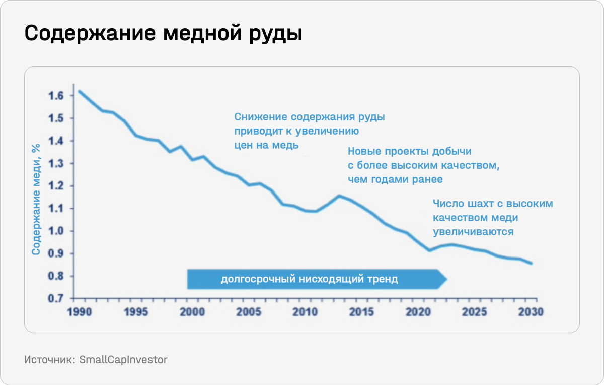 Кроме того, снижается содержание количества руды из-за истощения шахт. Получается, что необходимо переработать и измельчить гораздо больше горной породы, чтобы получить такое же количество меди. Потенциально, это может привести к сокращению мирового производства меди и увеличению давления на ценообразование.