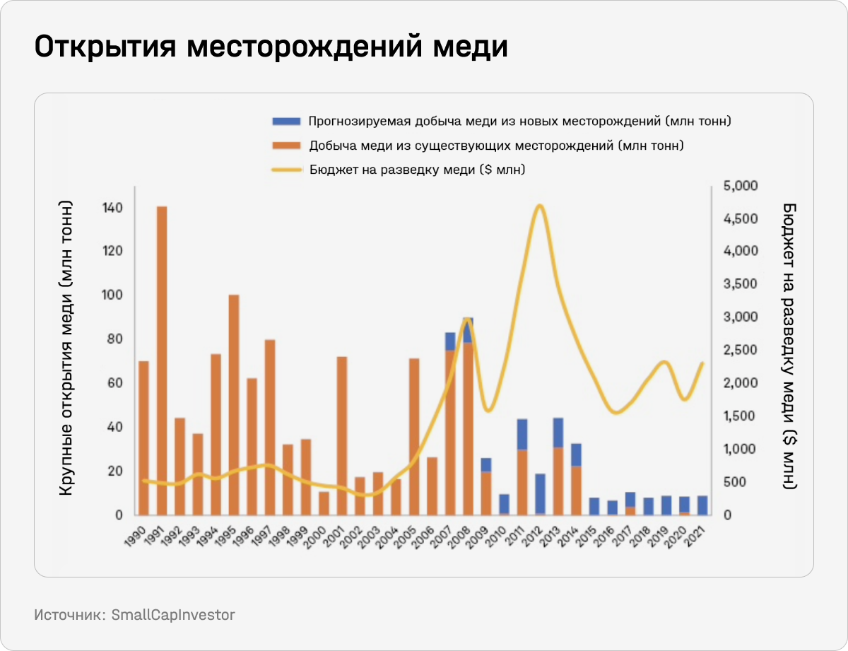Прежде всего, это связано с тем, что разработка нового месторождения может занимать до 15 лет, поэтому корпорации сосредотачиваются на уже существующих активах. Подсчитано, что всего с 1990 года было сделано 224 крупных открытия меди, из которых 16 обнаружили за последнее десятилетие и только одно с 2015 года. Учитывая это, в случае нового всплеска спроса на рынке меди производителям просто не хватит ресурсов, чтобы оперативно увеличить объемы.