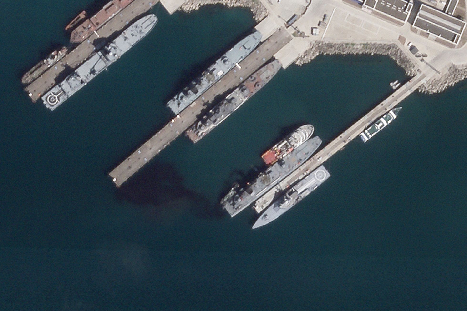 Спутниковый снимок, сделанный днем 4 августа 2023 года. Виден поврежденный большой десантный корабль «Оленегорский горняк», который накануне ночью подвергся атаке украинского катера-камикадзе на внешнем рейде порта Новороссийска. Корабль получил крен на левый борт, но остался на плаву и был отбуксирован к причалу.
