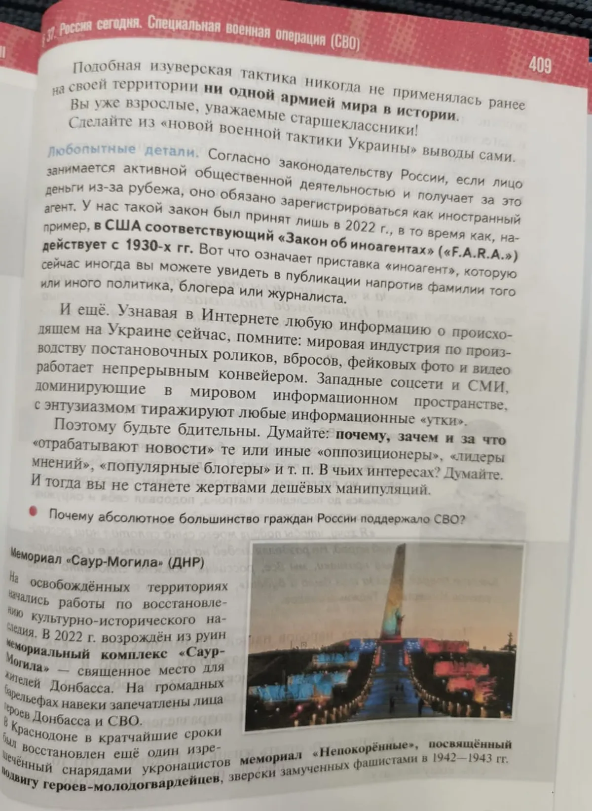 Также учебник рассказывает о законе об «иноагентах», как и пропаганда, ссылаясь на похожий закон в США. «Будьте бдительны. Думайте: почему, зачем и за что "отрабатывают новости" те или иные "оппозиционеры", "лидеры мнений", "популярные блогеры" и т. п. В чьих интересах? Думайте. И тогда вы не станете жертвами дешевых манипуляций», — призывают авторы.