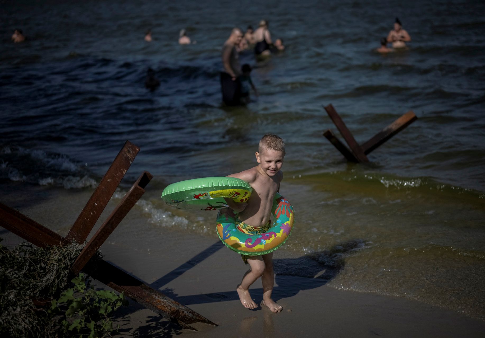 На юге Украины — 40-градусная жара. Жители Запорожья спасаются от нее на пляжах Днепра, укрепленных противотанковыми ежами