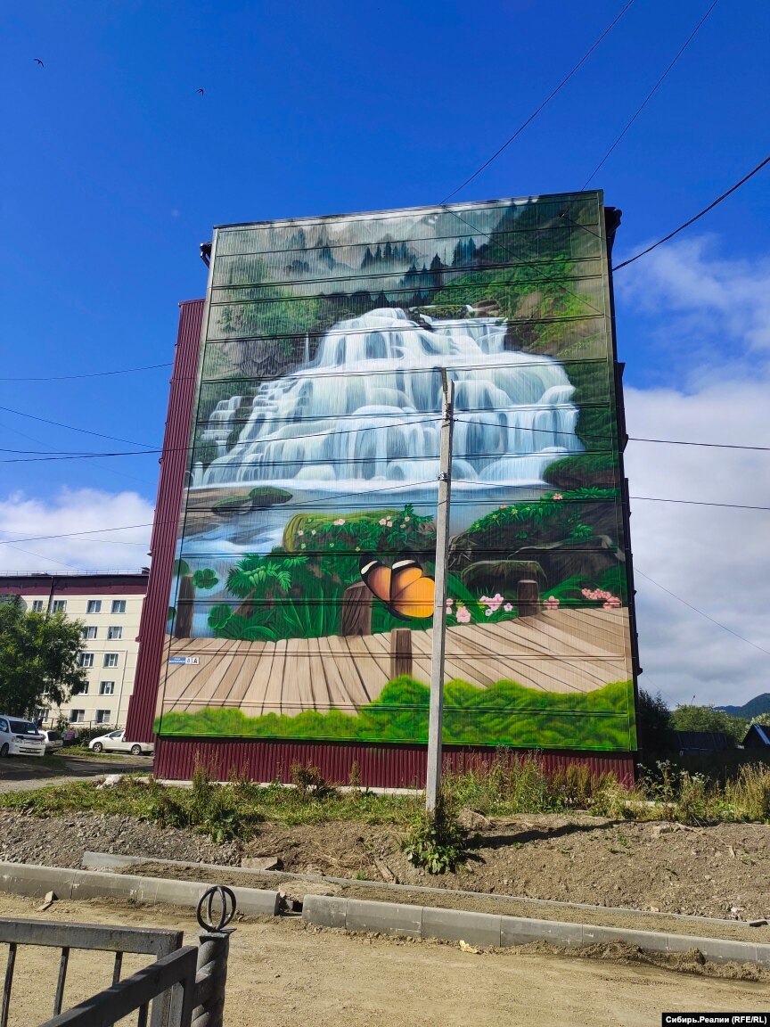 Недавно на стене одной из пятиэтажек в Быкове появился мурал. На нем изображены Быковские пороги – искусственно созданный каскад на реке Красноярка, туристическая достопримечательность района. Такие граффити финансируются из бюджета в рамках президентского проекта "Формирование комфортной городской среды". Цель проекта, как говорят власти, "сделать населенные пункты более удобными для жителей".