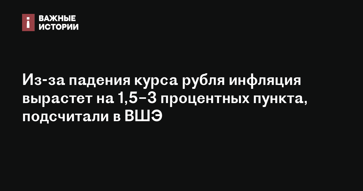 Из-за падения рубля инфляция в России вырастет на 1,5–3 п. п., пишет РБК со ссылкой на анализ Центра развития НИУ ВШЭ. Перенос валютных издержек в цены оказался отложенным из-за большого объема запасов, сформированных при более крепком курсе, и «пока не проявил себя в полной мере», отмечают авторы.