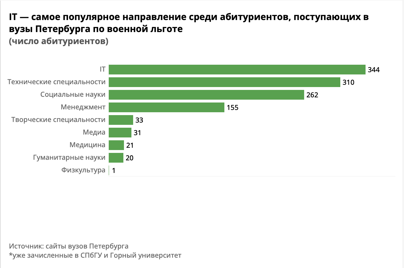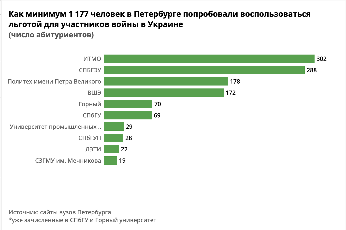 С учетом зачисленных в СПбГУ и Горный университет. Общее число абитуриентов, пытавшихся воспользоваться военной льготой в эти вузы, неизвестно.