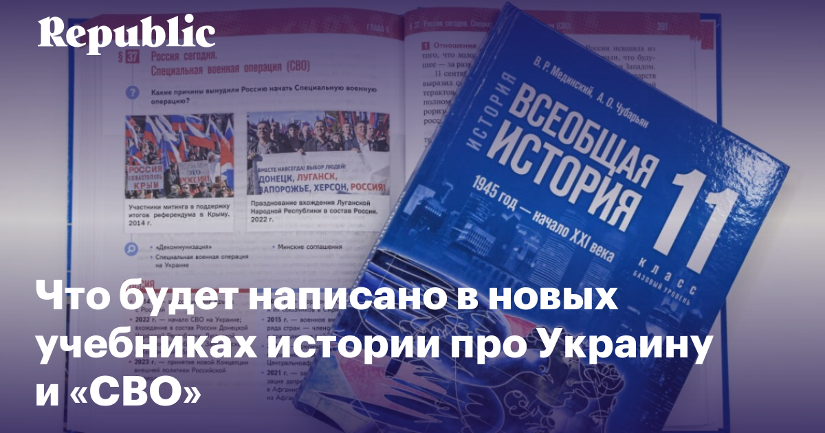 В России представили новые учебники истории для 10-х и 11-х классов. Это будут единые государственные учебники для всех, один из авторов и руководитель проекта — помощник Путина Владимир Мединский. В учебниках об истории России переписали главы, посвященные периоду с 1970-х до 2000-х годов, и добавили раздел про «специальную военную операцию» в Украине.