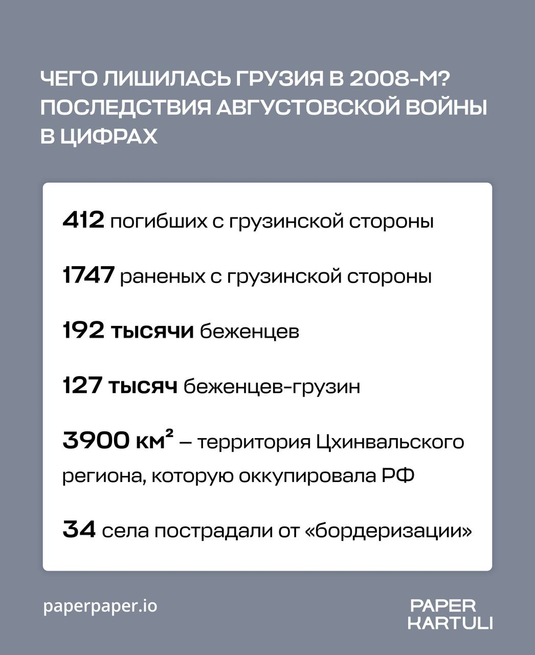 Августовская война — это не только погибшие солдаты, полицейские, журналисты и мирные жители, но и продолжающиеся оккупация и «бордеризация», а также всё еще не решенная проблема беженцев и разделенных семей вблизи линии соприкосновения. Paper Kartuli с помощью цифр рассказывает, чего лишилась Грузия в 2008-м.