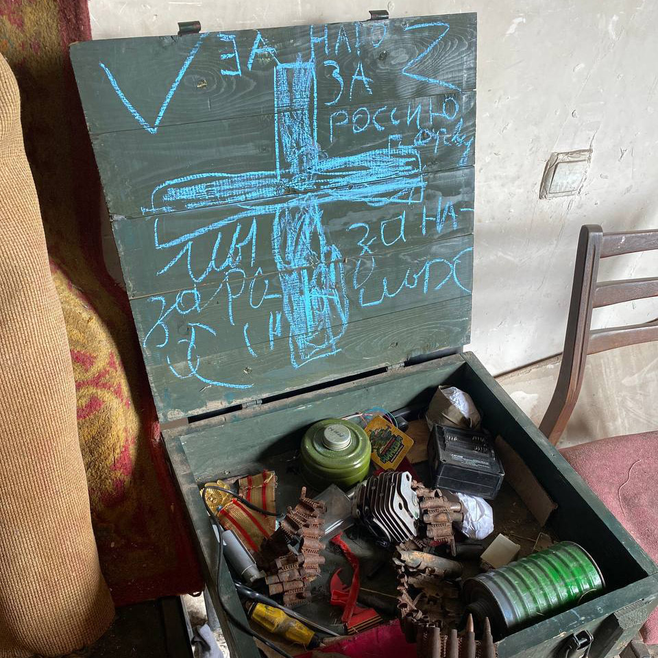 У мальчика была коробка с игрушками, на которой написаны знаки V и Z, «За Россию порву», «За нашых». Предметы, с которыми играл мальчик, игрушками можно было назвать очень условно. В его коробке лежали пулеметная лента, причем два патрона остались в ней до сих пор, фильтр от противогаза, отвертка, шило, погоны, какое-то зарядное устройство.