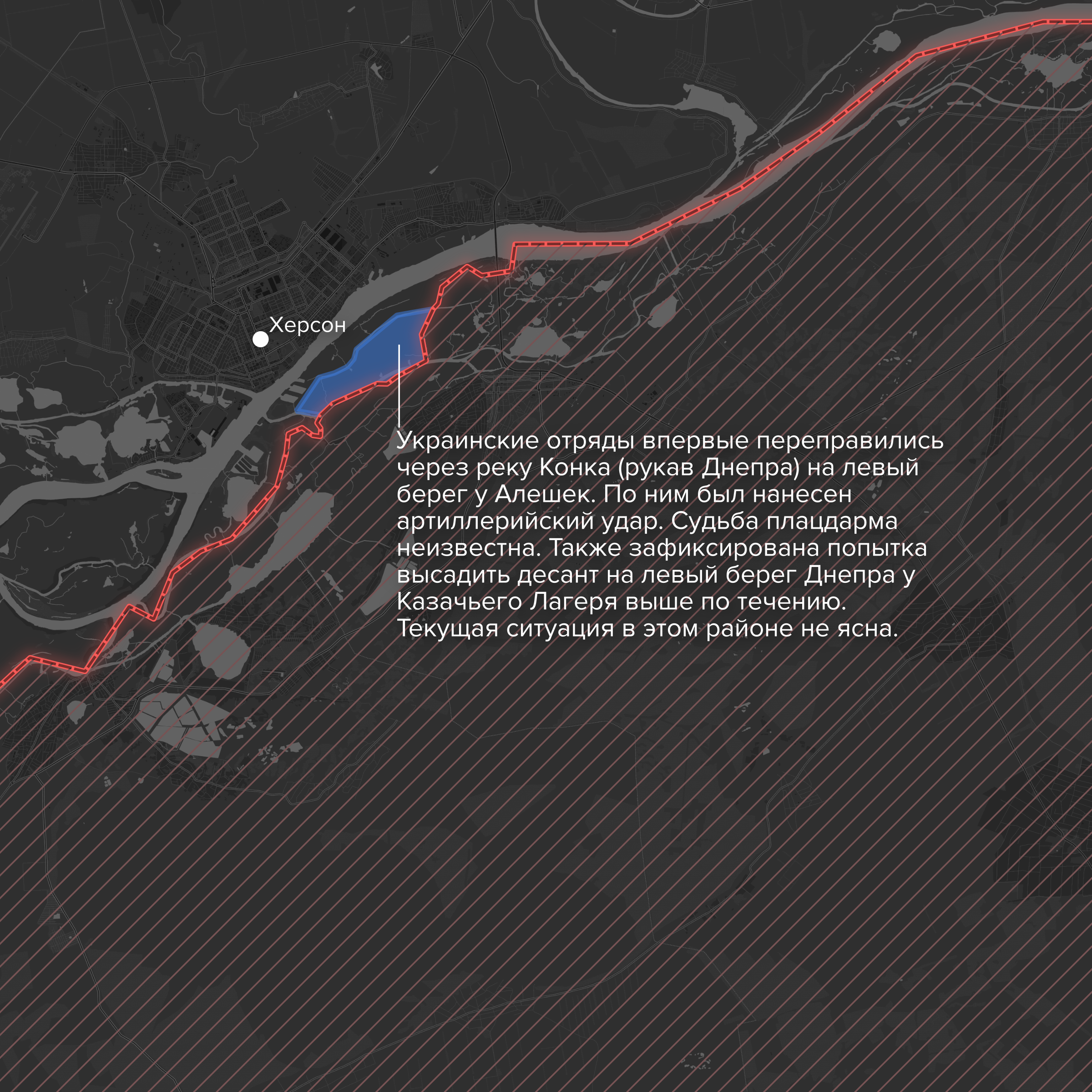 - In June, the AFU created a bridgehead near the ruins of the Antonivsky bridge. Swamps and the Konka river (a tributary of the Dnipro) separate this bridgehead from the city of Oleshky. Russia’s Armed Forces therefore were never able to destroy the bridgehead, but neither could the AFU approach the Konka.