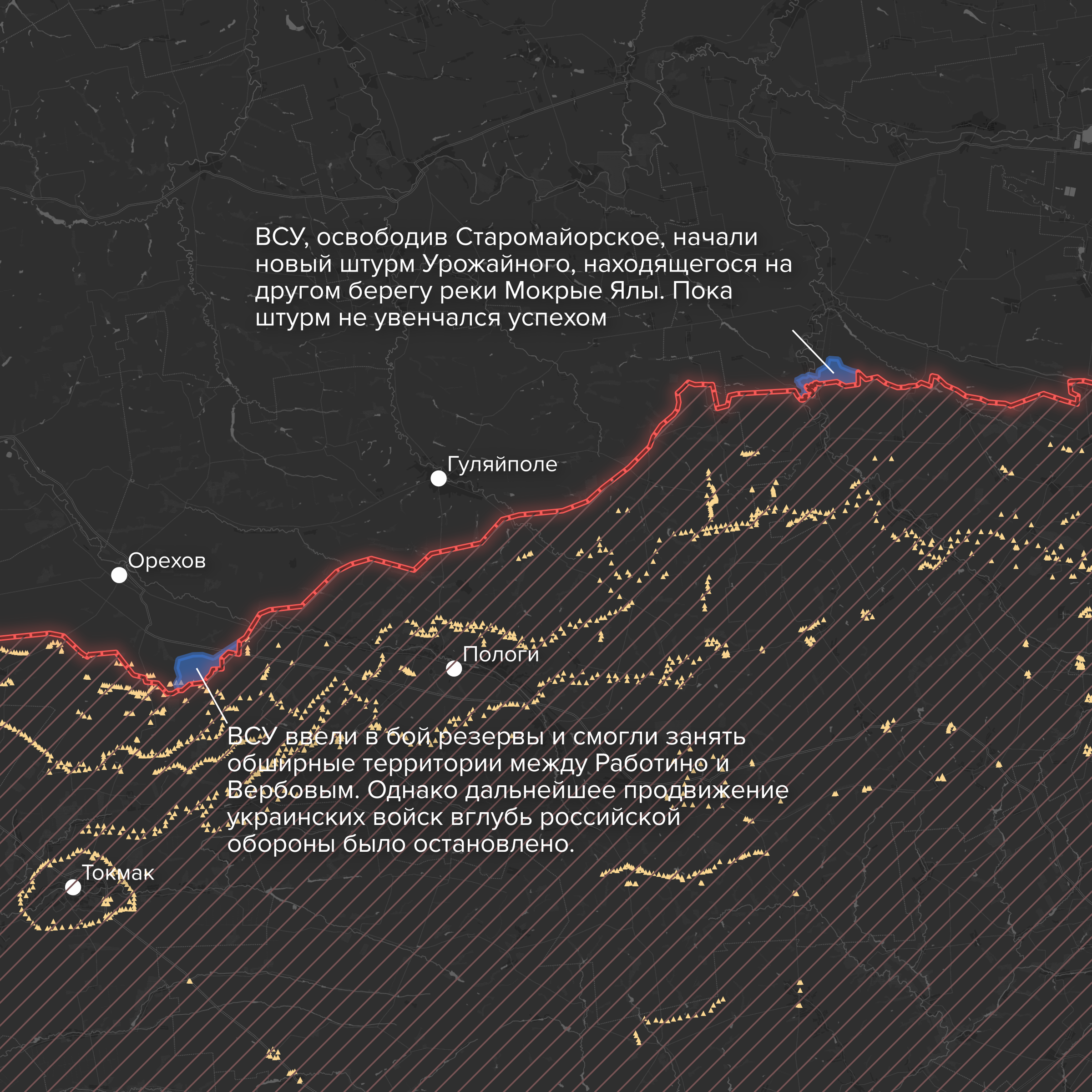 - On the border of the Zaporizhzhia and Donetsk regions (in the direction of Velyka Novosilka) the AFU was able to broaden the front for its offensive. In June, Ukrainian forces advanced to the south along the narrow valley of the Mokri Yaly river, but Russian troops stationed on the hills above the valley wouldn’t allow the AFU to proceed farther. Now, with the help of an offensive from Rivnopil, Ukrainian troops have forced Russia to abandon its positions on the hills. At the very beginning of August, Ukraine’s Armed Forces liberated Staromaiorske (or, at least, most of it — a lack of video evidence makes it difficult to say for sure). On August 8, the Ukrainian army launched a decisive assault on the neighboring village of Urozhaine, across the Mokri Yaly.