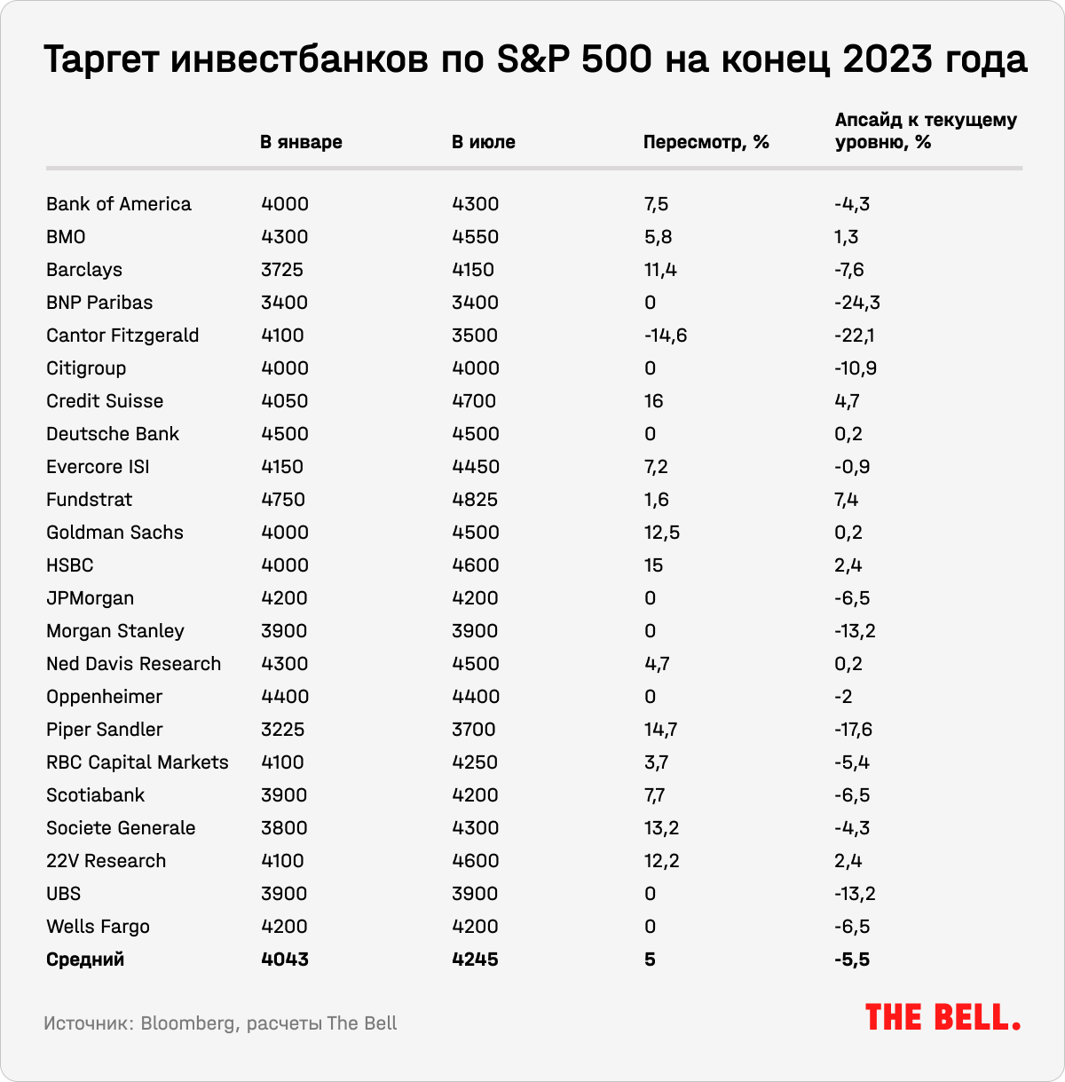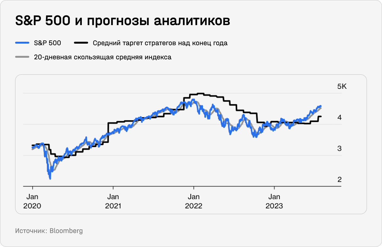 В результате многие стратеги — даже главные «медведи» вроде Майка Уилсона из Morgan Stanley, который прямо признал ошибку в прогнозе на этот год, — в июле были вынуждены капитулировать и увеличить таргеты по S&P 500 на конец года.