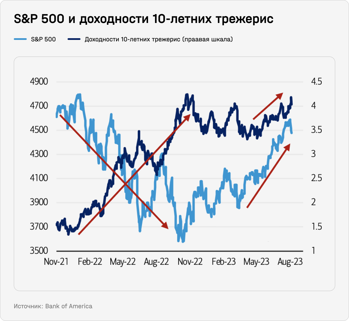 То, что рынок акций не реагирует на рост ставок, делающий облигации более привлекательными, — характерная картина для 2023-го. В 2022-м рост ставок был главной причиной падения рынка.
