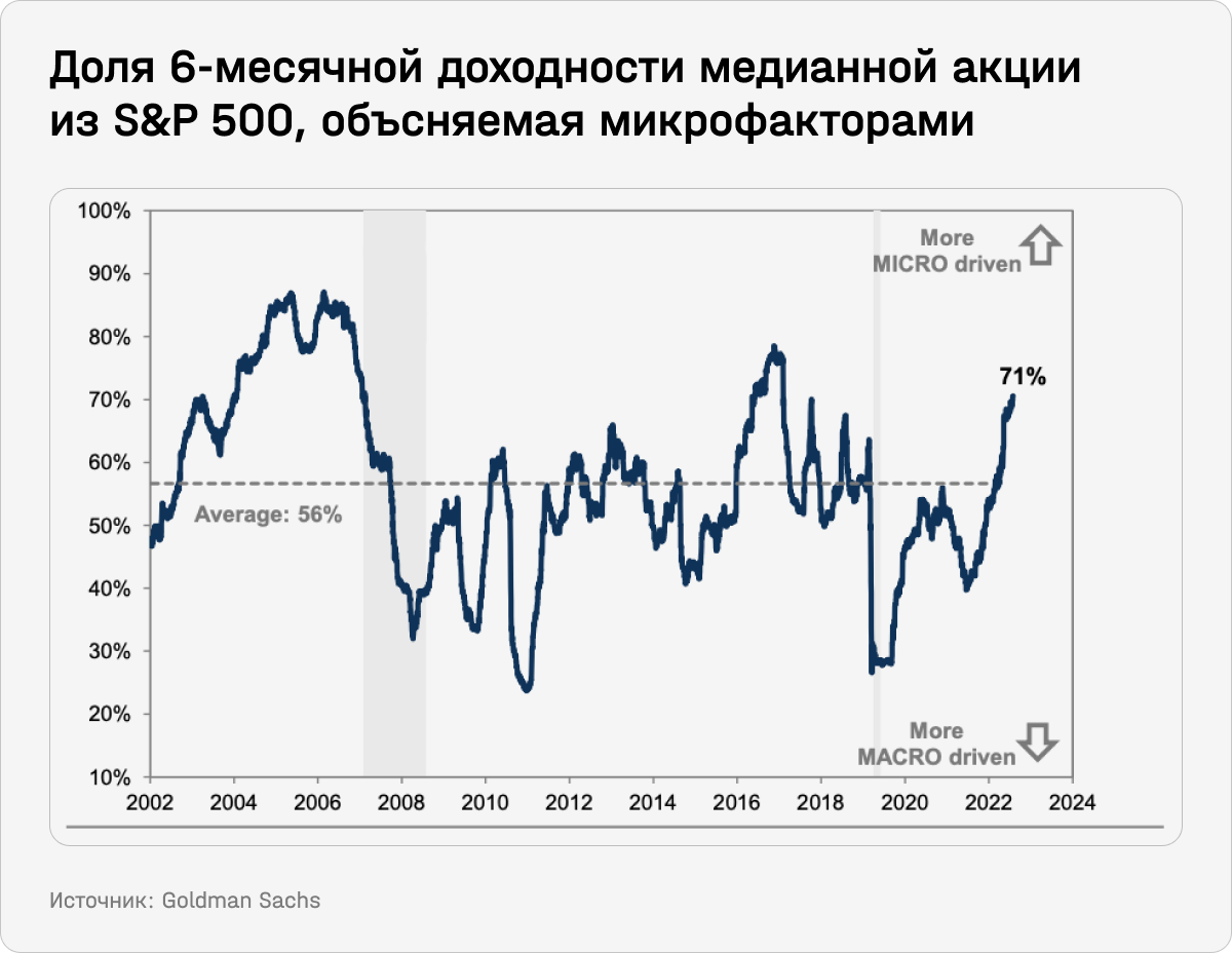 В результате дисперсия трехмесячной доходности акций из S&P 500 выросла с 5 п. п. до 29 п. п., что примерно равно среднему показателю за последние 30 лет (28 п. п.). При этом относительно последних 10 лет, когда волатильность на рынках была снижена за счет ультрамягкой денежно-кредитной политики, текущий показатель находится в 85-м процентиле. Иными словами, влияние микрофакторов становится все больше.
