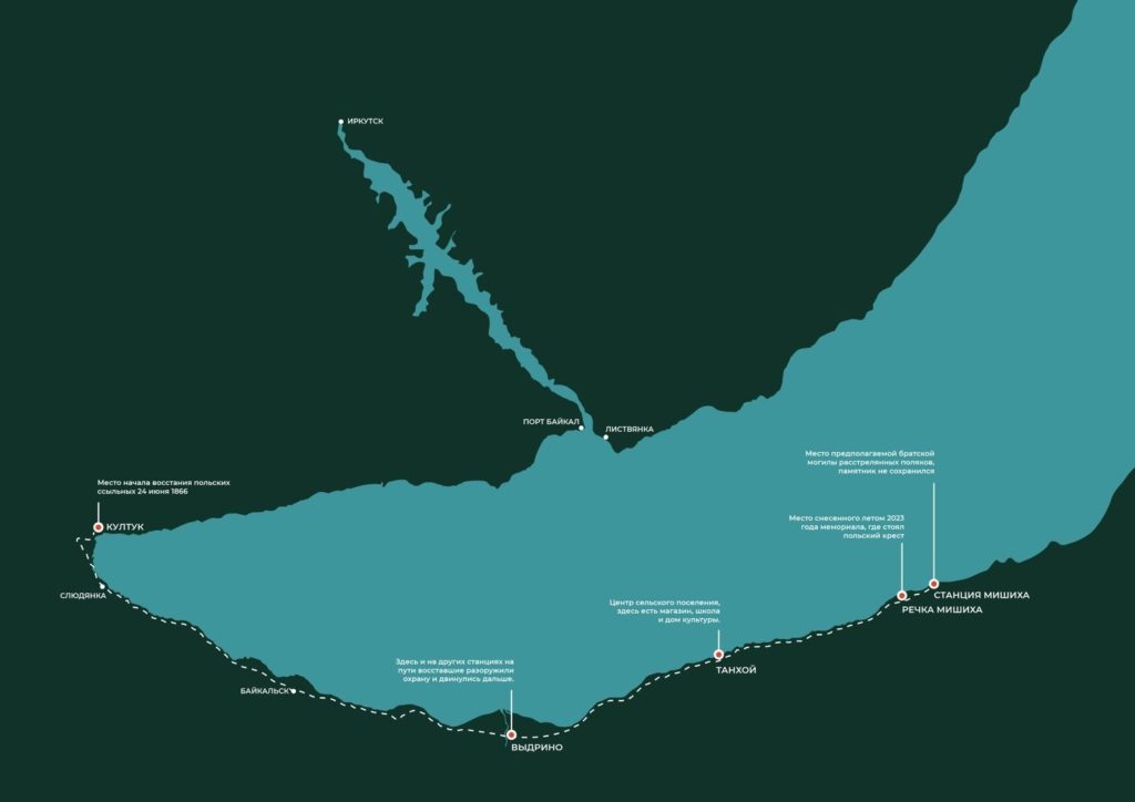 Новый Кругобайкальский тракт начали строить в 1861 году: предыдущая дорога от Иркутска в сторону Монголии шла западнее Байкала, через горный хребет, и была почти непроходима большую часть года. Строительство вели и сосланные после Польского восстания 1863-1864 годов поляки: тогда после неудачной попытки мятежа за независимость Польши в Сибирь были отправлены от 18 до 22 тысяч человек. В 1866 году ссыльные решились на восстание. Это был авантюрный план: разоружить охрану, домчаться на лошадях до китайской границы, там пересесть на английские корабли и вернуться на Родину — в Польшу.
