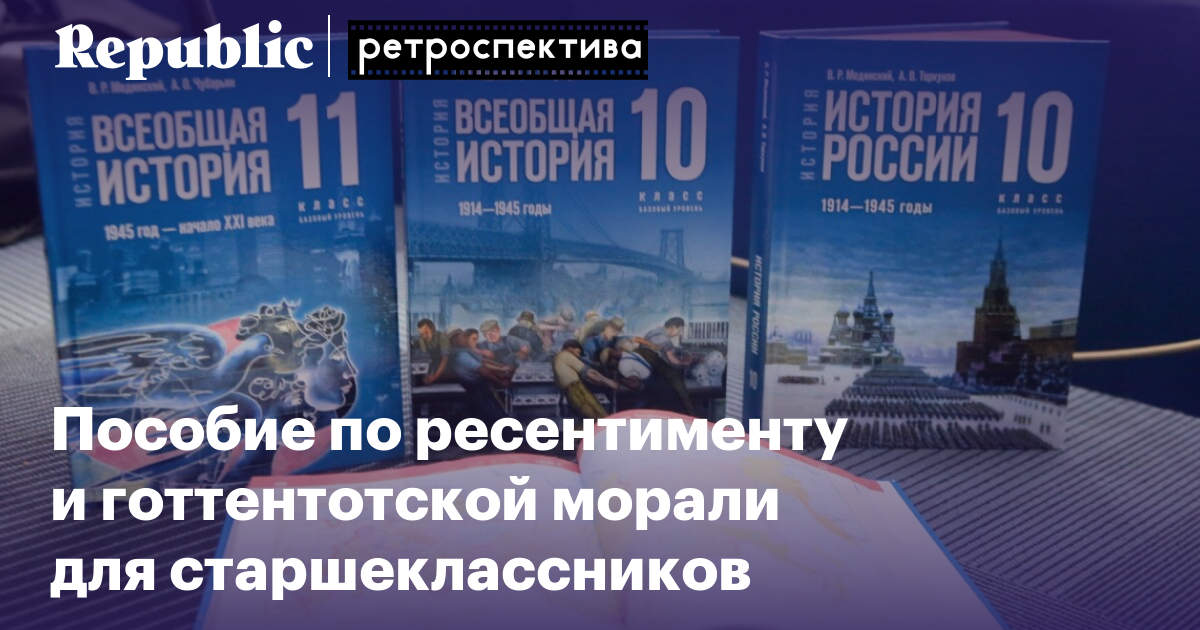 Правда, подросткам нужны не одни игрушки, но и мудрые книги. На минувших выходных в открытый доступ выложили pdf-версию наспех сотворённого («авторы писали буквально своей рукой многое из последнего перечисленного») учебника по истории России для одиннадцатиклассников. Того самого, от Сталина до нынешних дней, за авторством Владимира Мединского и Анатолия Торкунова, где «значительно меньше чисел, дат, статистики и больше рассказов о людях и событиях».