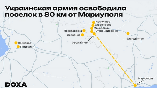 В ходе контрнаступления Вооруженные силы Украины освободили поселок Урожайное в Донецкой области, сообщает заместительница министра обороны Украины Анна Маляр. Урожайное находится в 80 километрах от оккупированного Мариуполя. В пяти километрах от поселка находится важный транспортный и логистический узел — село Старомлиновка.