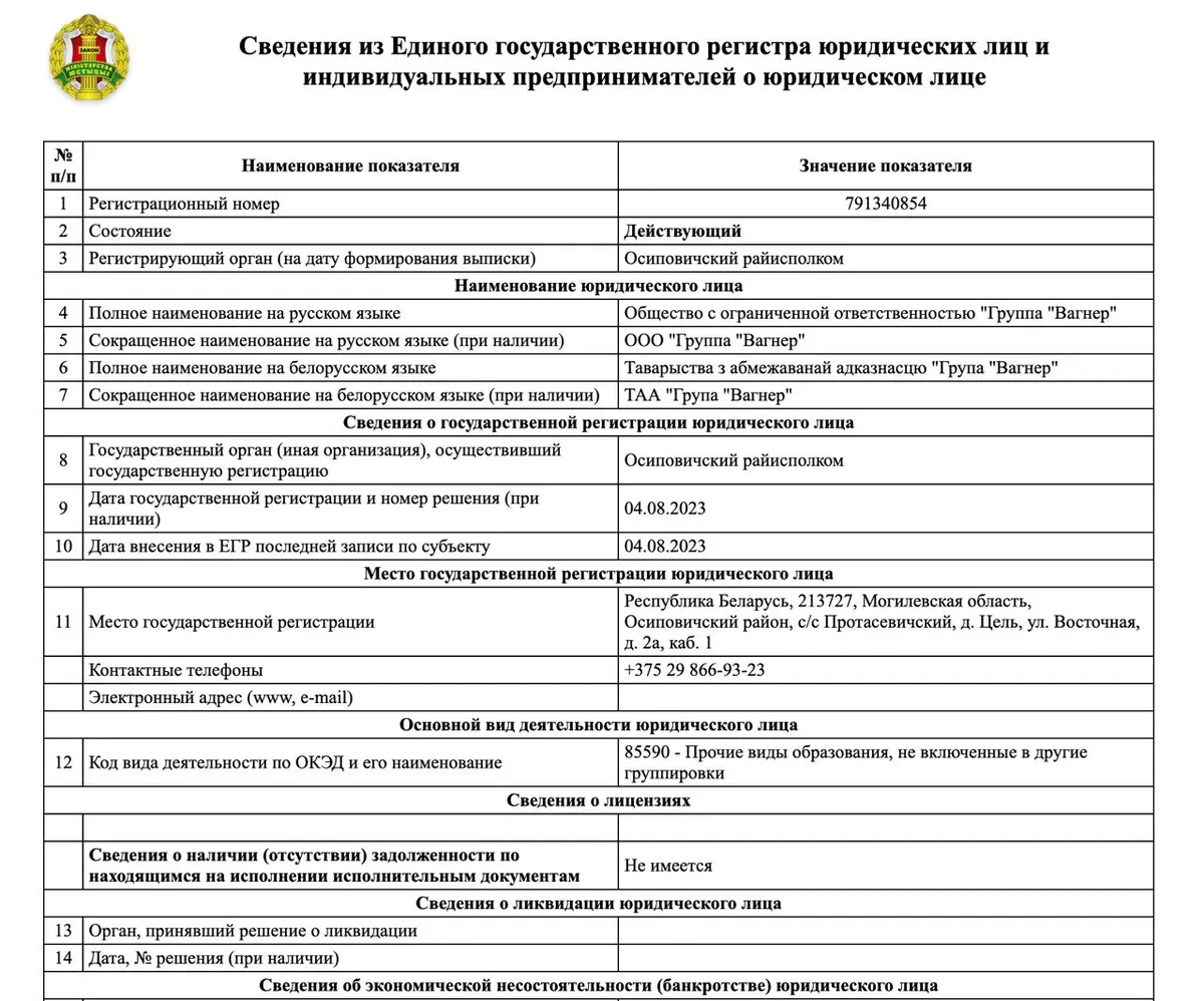 В реестре юрлиц и индивидуальных предпринимателей Беларуси появилось ООО «Группа "Вагнер"», ее деятельность обозначена как «прочие виды образования». На это обратило внимание издание «Ротонда».