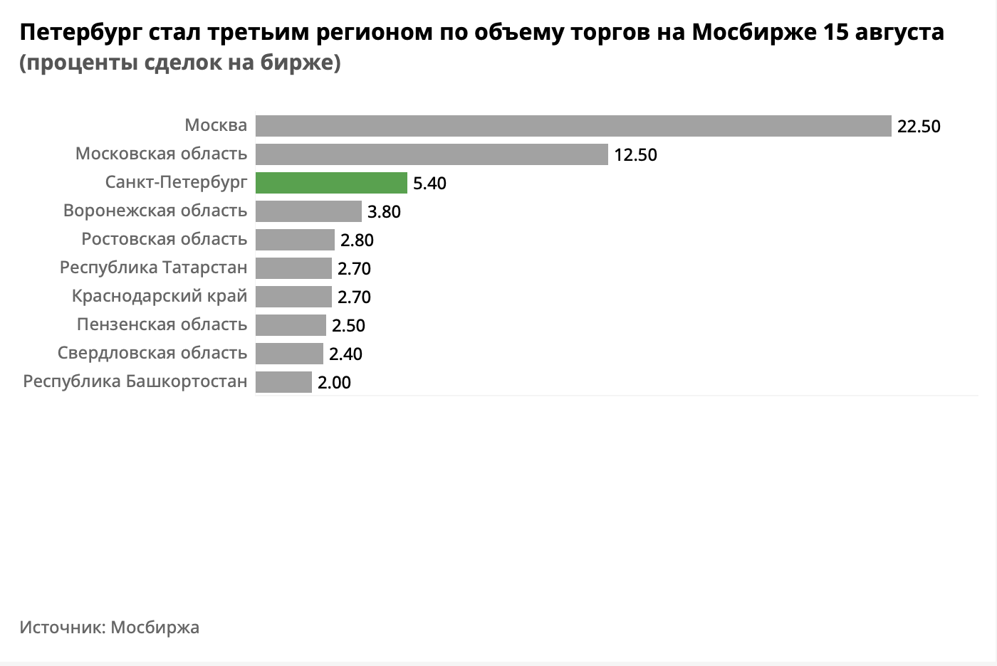 Петербург стал третьим регионом по объему торгов к концу дня. Жители города совершили 5,4 % сделок, уступив Москве и Московской области. На эти регионы пришлась треть сделок. Помимо этого, в торгах активно участвовали жители Воронежской области, Ростовской области, Краснодарского края и Татарстана.