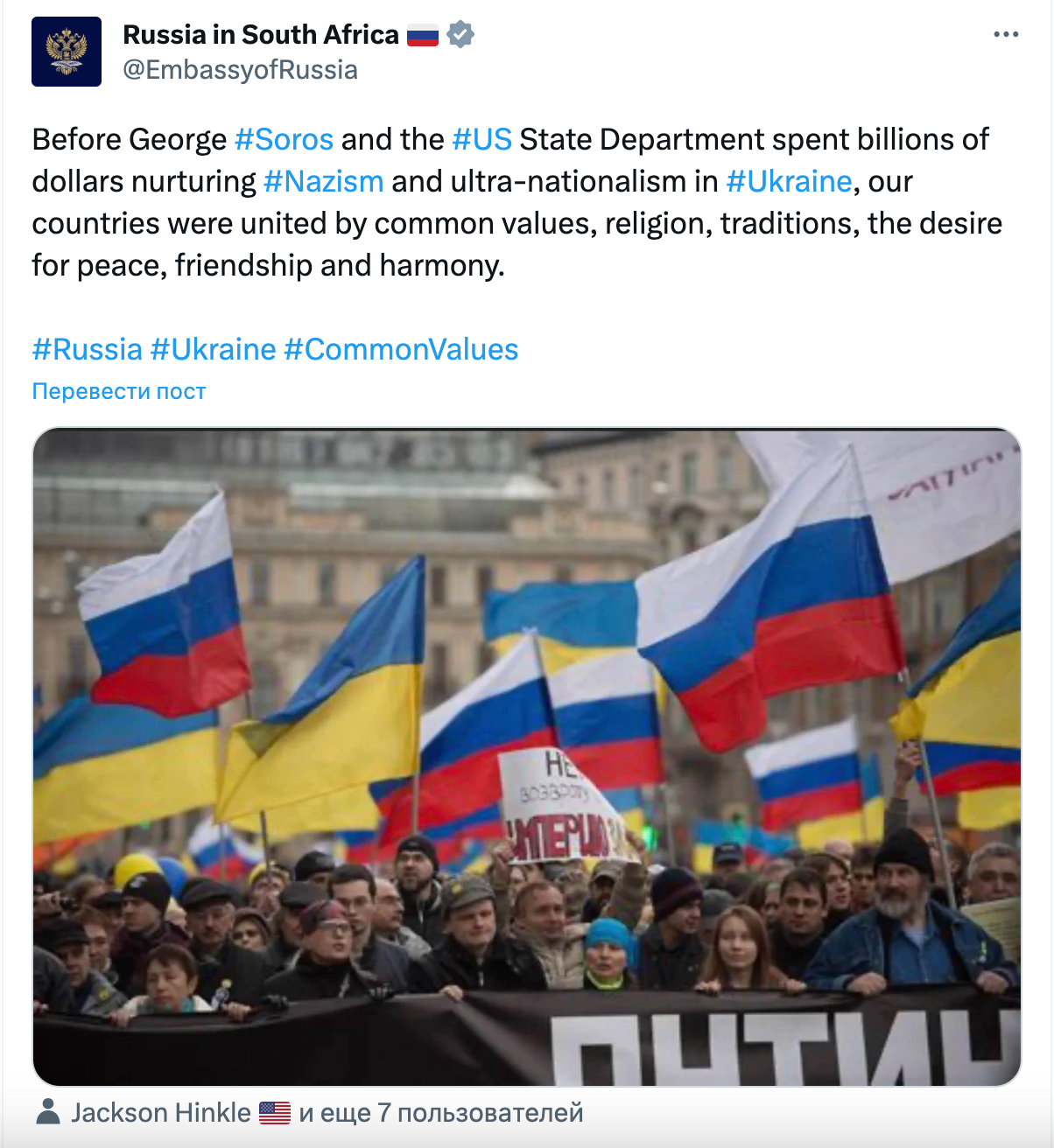 Посольство России в ЮАР в своем твиттере опубликовало пост, в котором говорится о том, что раньше РФ и Украину объединяли общие ценности и стремление к дружбе. При этом проиллюстрировало твит посольство фотографией с антивоенного марша 2014 года, который проходил в Москве.