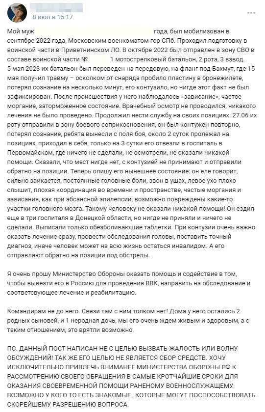 "Наши СМИ транслируют красивую картинку происходящего ТАМ (на войне в Украине. – СР), а я вижу ее изнутри, всю грязь и скотское отношение к нашим людям. Как звезды героев получают "удобные и угодные" полковники, которые положили десятки наших парней, ни в грош не ставя их жизни, как командиров с микропереломами пальцев тут же эвакуируют на вертолете со всеми справками и госвыплатами, в то время как ... люди с контузиями, осколками в теле, переломами остаются на передовой и продолжают нести свой крест, потому что для них в госпиталях нет мест. Как люди без ног через суд доказывают, что ног лишились Там, на поле боя, а не вдруг трамвай переехал! Столько историй прошло через меня за последнее время, столько искалеченных судеб и разрушенных семей, что, наверное, впору писать целую книгу, в дополнение к новым учебникам истории, которые с "достоинством" описывают происходящие сейчас события. Чтобы хоть немного показать людям правду, которую не показывают по телевизору!" – написала жена мобилизованного на своей странице в соцсети.