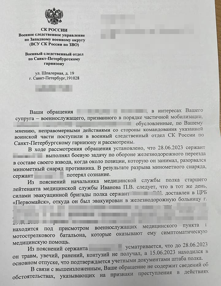 – Пару дней назад я получила ответ от Военного следственного управления СК РФ по Западному военному округу, в котором говорится о том, что мой муж до сих пор находится в санчасти "там", и за ним ухаживают медики, оказывая ему ситуативную помощь, – удивляется Катя. – Это письмо от 24.07, но на тот момент его уже вывезли, он был в Ростове, Питере и Северодвинске. Там ещё кое-какие моменты не совпадали с действительностью. Я понимаю, что все структуры умеют хорошо отписываться. Многие факты они переставляют так, как им нужно, поэтому оспорить те моменты, о которых они мне написали в письме, уже невозможно. Но то, что он, по их мнению, находится ещё там, а по факту он уже здесь, самое интересное. (У редакции есть копия ответа Екатерине. – СР).