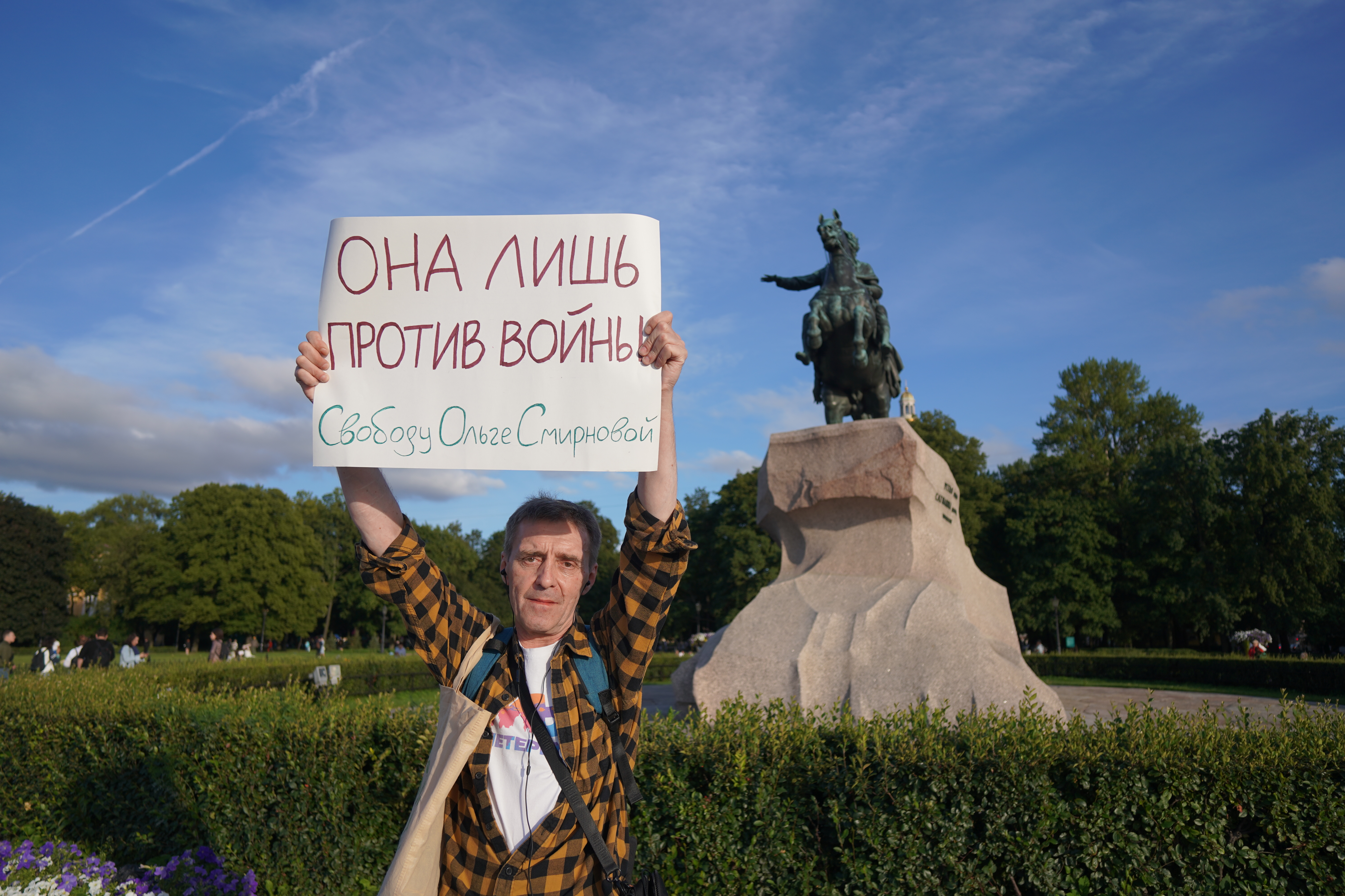 Петербургские активисты провели на Сенатской площади акцию в поддержку Ольги Смирновой, обвиняемой по уголовному делу о "фейках" о российской армии. С плакатами на площадь вышли Виталий Иоффе, Татьяна Сичкарева и Екатерина Стримакова, передает корреспондент Север.Реалии.
