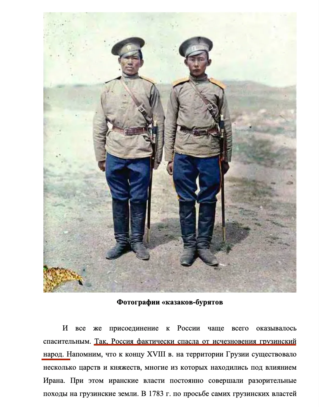 «Гуманитарный» учебник лишь выглядит серьезнее. Он больше погружен в историю, где национальное государство появляется уже в XV веке, а пространства таковы, что «вклад нашей страны в сохранение устойчивости мировой экосистемы вдвое больше, чем США и Канады вместе взятых, Бразилии и Австралии» (с. 30). Авторы признают, что не всегда народы на этих землях хотели входить в состав России, были восстания, но «всё же присоединение к России чаще всего оказывалось спасительным. Так, Россия фактически спасла от исчезновения грузинский народ» (с. 86). Русская власть на Кавказе — тоже благо, а герой-символ — генерал Ермолов, который дал кавказцам культуру, экономическое развитие и гражданское равноправие.