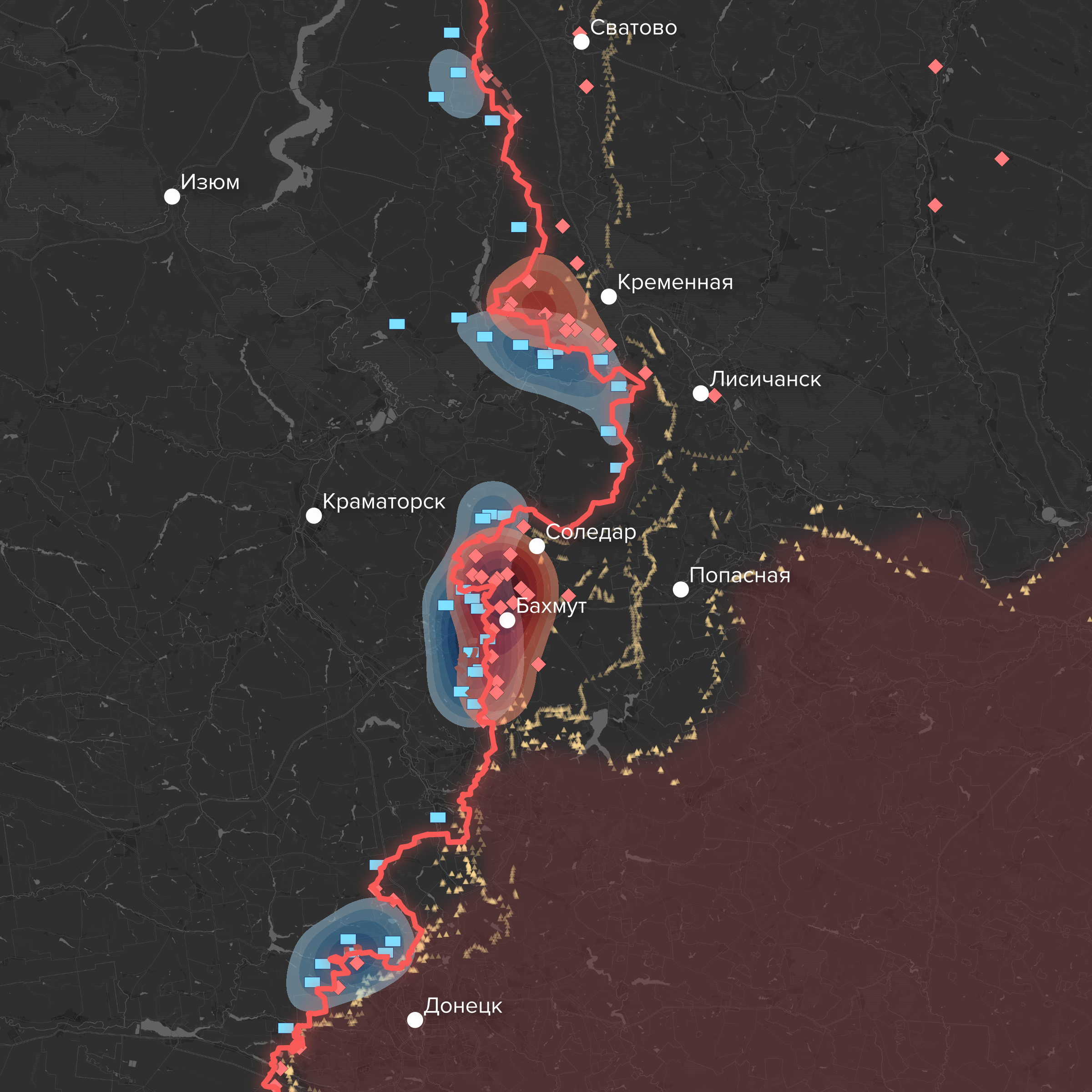 Более крупные российские резервы находятся не на юге страны, а на севере. Там — в районе от Кременной до Купянска — Генштаб РФ пытается организовать собственное наступление. Российские войска — пока относительно небольшими силами — наступают на Купянск. Точнее, на ту его часть, что находится на восточном берегу реки Оскол (большая часть города располагается на противоположном берегу). В случае захвата переправ через Оскол у Купянска ВС РФ сильно осложнят снабжение всей группировки ВСУ на восточном берегу Оскола — в районах Харьковской, Луганской и Донецкой областей, которые они освободили прошлой осенью. Для этого, очевидно, потребуются большие силы, которые пока находятся в резерве в глубине Луганской области и на полигонах Белгородской области России.