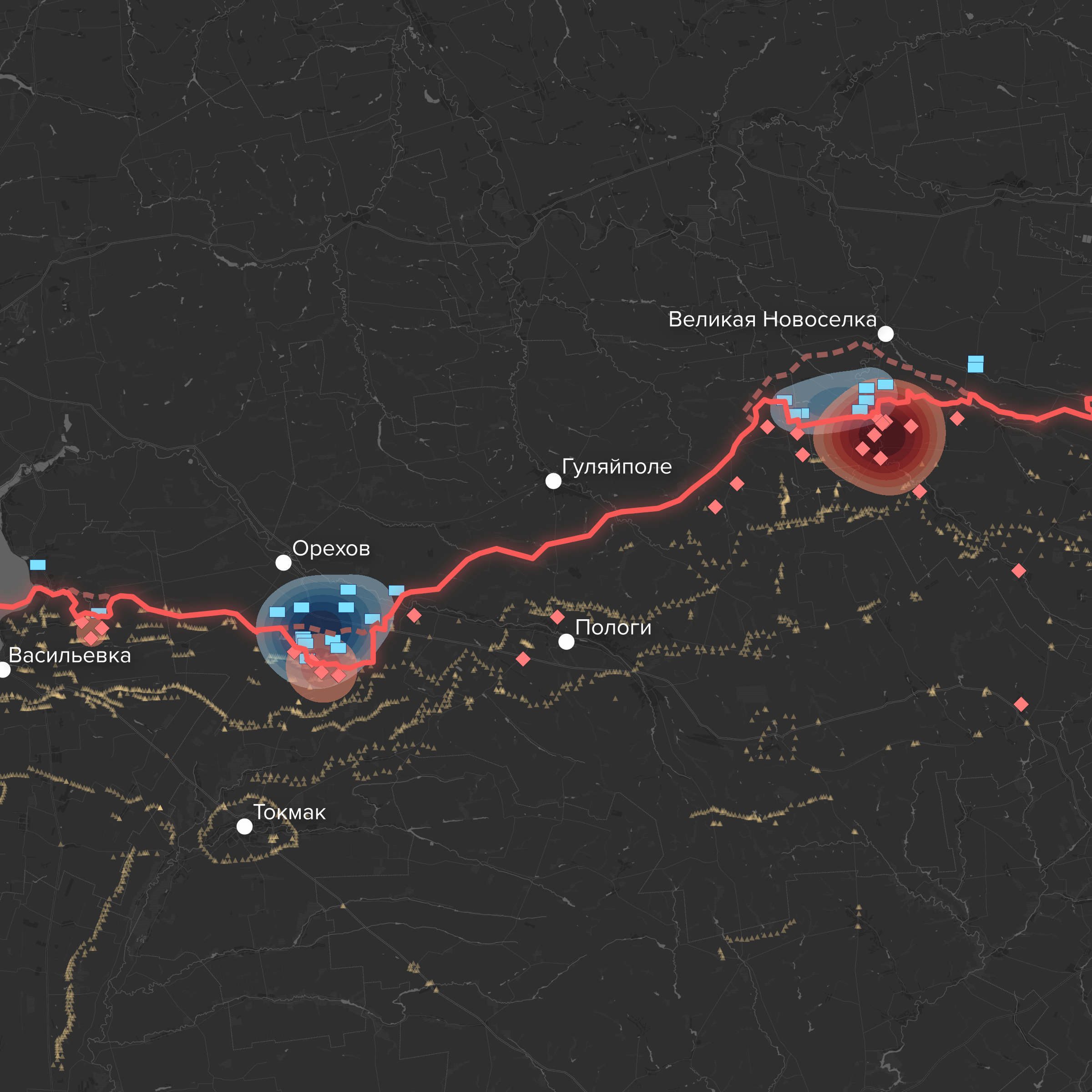 - В конце июля усиленная украинская группировка южнее Орехова смогла преодолеть «серую зону» глубиной в несколько километров, в которой ее встретили многочисленные минные поля и редкие небольшие опорные пункты российской армии, состоявшие из расчетов противотанковых ракетных комплексов. Прорыв обеспечили резервы: ВСУ удалось прорваться через минные поля между Работино и Вербовым силами вновь введенных в бой бригад.