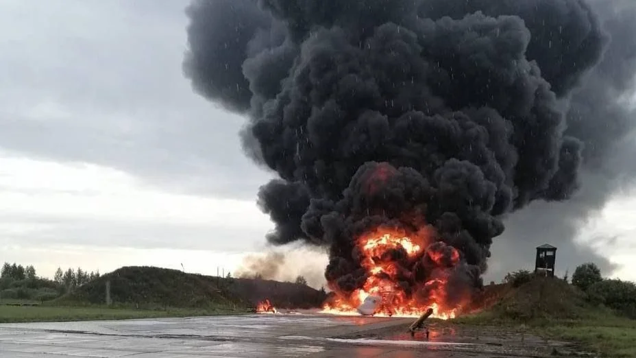 Взрыв бомбардировщика Ту-22М3 на военном аэродроме в Новгородской области. Фото: Ukraine Weapons Tracker / Twitter