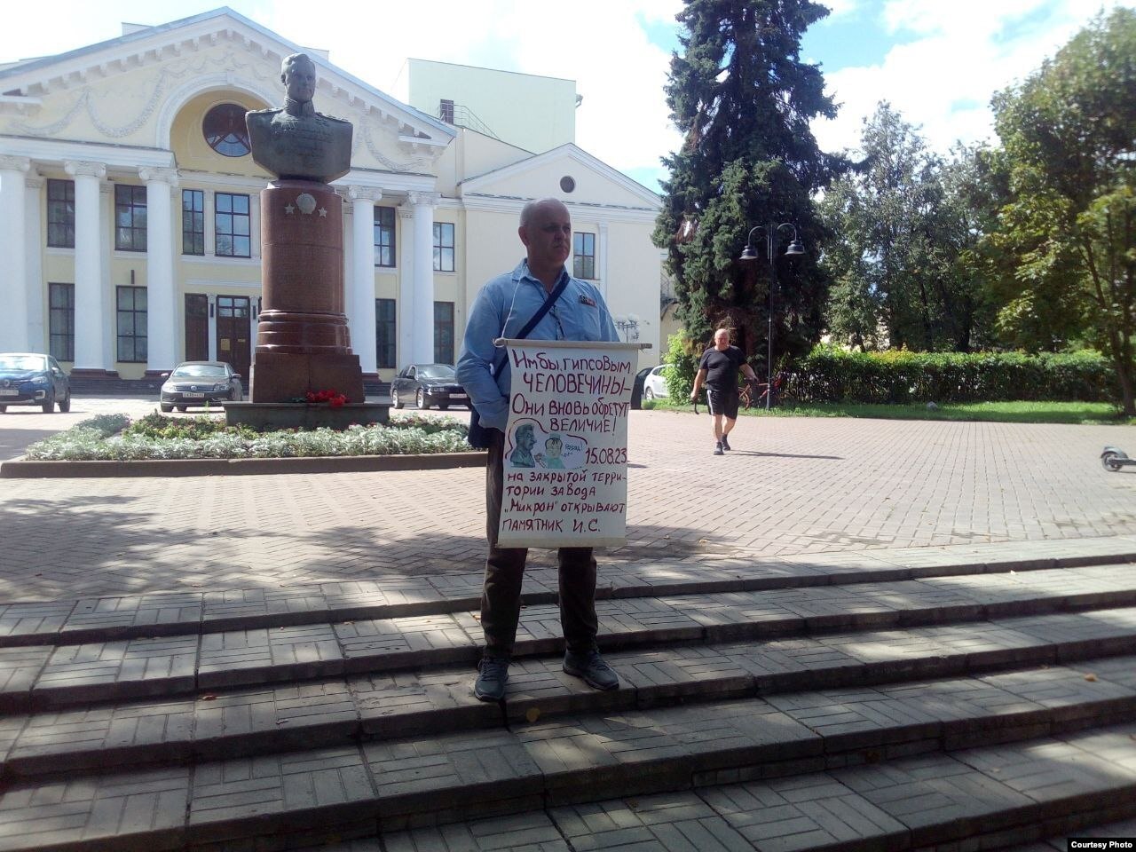 В Псковской области в городе Великие Луки на прошлой неделе открыли памятник Сталину. Он появился на территории завода "Микрон" по решению руководства предприятия, но смотреть на восьмиметровое изваяние приходится всем жителям города. Однако не всех это устраивает: житель соседнего города Новосокольники, бывший полицейский и антисталинист, Андрей Иванов специально приехал в Великие Луки, чтобы встать в одиночный пикет против установки памятника. В руках он держал плакат со словами из песни "Ночной дозор" Александра Галича. Редакция Север.Реалии поговорила с Андреем об эволюции его взглядов на Сталина, об истории репрессий в его семье и необходимости покаяния.