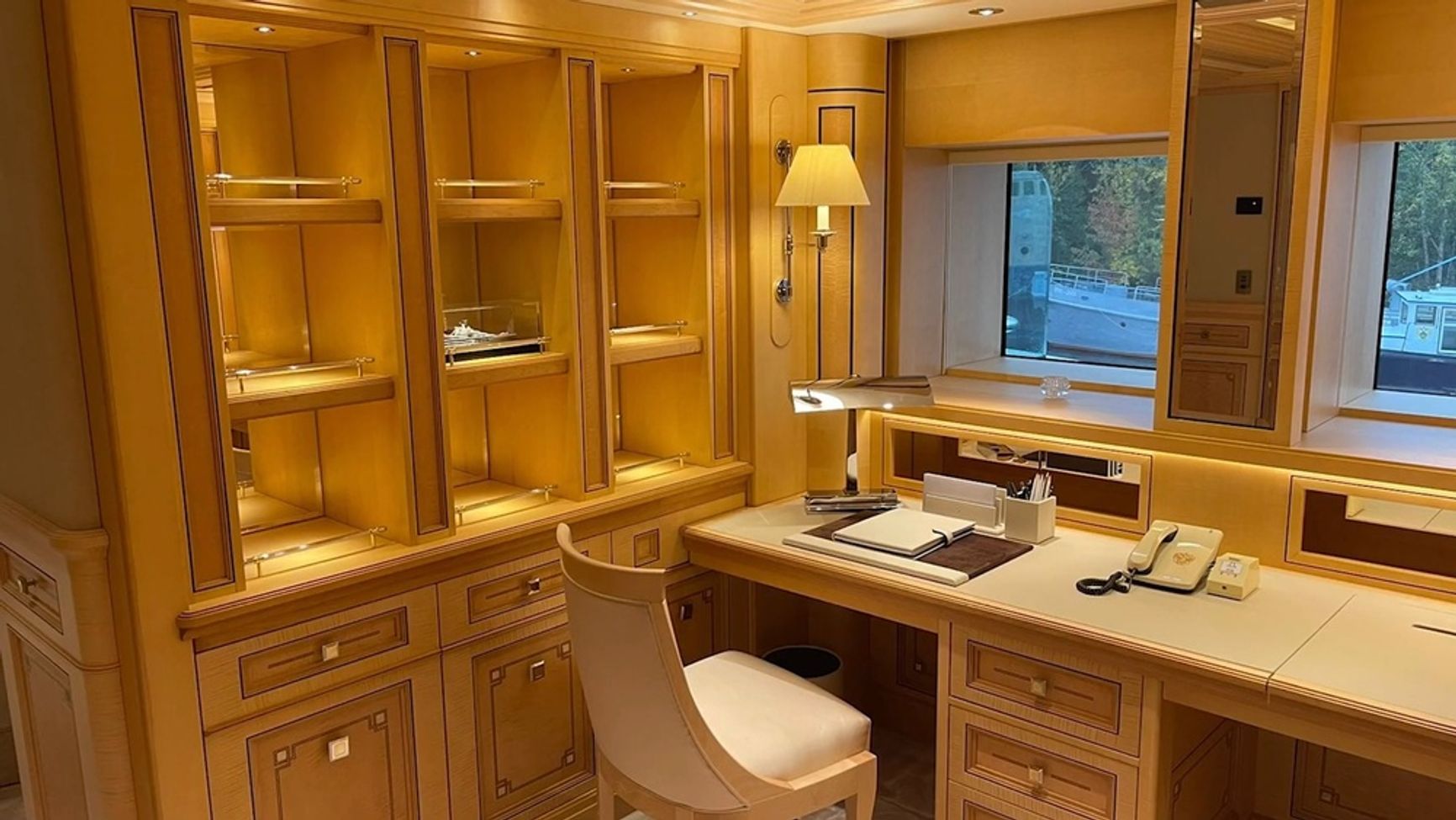 Кабинет владельца яхты, каюта для работы. На полке стоит макет арестованной «Шахерезады». На фото также видно судно с эмблемой ФСБ за окном, а на столе — телефон спецсвязи без кнопок и с гербом.