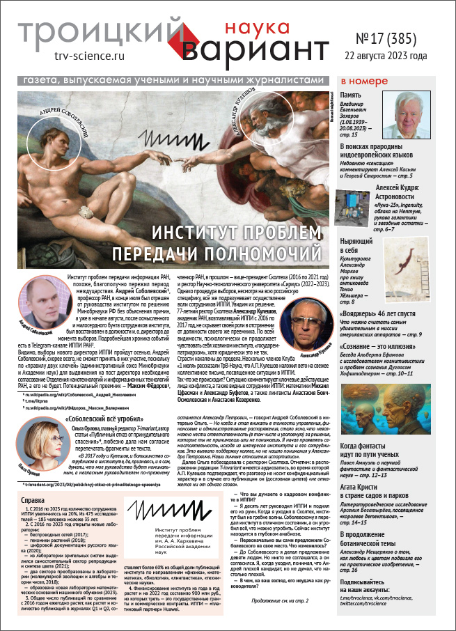 Весь номер газеты «Троицкий вариант — Наука» № 385 от 22 августа 2023 года в PDF