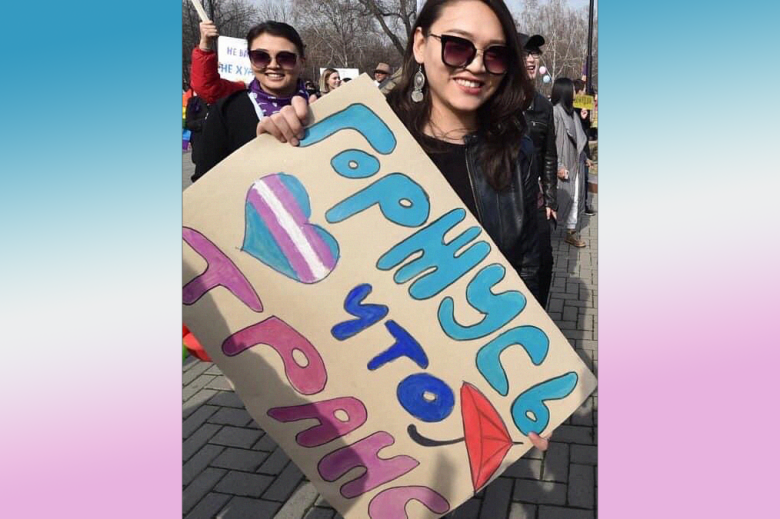 В 2019 году я вышла с плакатом «Горжусь, что транс». Это было выражение моей транс-гордости: что бы вы мне ни говорили, я буду собой. Я выглядела как типичная кыргызская женщина: длинное платье, распущенные волосы. На марше были ЛГБТ-флаги, ЛГБТ-люди. Восьмое марта — значимая дата для ЛГБТ-движения, для феминистского движения. Нас было довольно много. В наш адрес звучали угрозы. Ходили люди в гражданском. Они нас фоткали. Ко мне постоянно подходили грубые мужчины и говорили на кыргызском «Убери свой плакат, если не хочешь проблем». А я говорила, что уберу только когда закончится марш. Я шла тогда с мыслью, что мне терять нечего. Я и так уже избита, измучена. От меня отреклись мои родные люди. И я хотела продолжать. Страха не было.