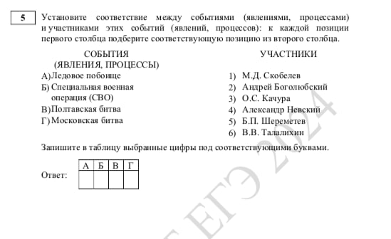 В пятом задании варианта просят соотнести имена военачальников с событиями, в которых они принимали участие. Среди пунктов задания указаны полковник «Народной милиции» самопровозглашенной ДНР Ольга Качура и «специальная военная операция».