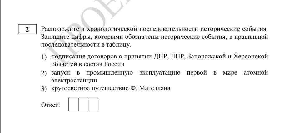 В задании №2 одиннадцатиклассникам предлагают расположить в хронологической последовательности три события — «подписание договоров о принятии ДНР, ЛНР, Запорожской и Херсонской областей в состав России», запуск первой в мире атомной электростанции и кругосветное путешествие Фернана Магеллана.