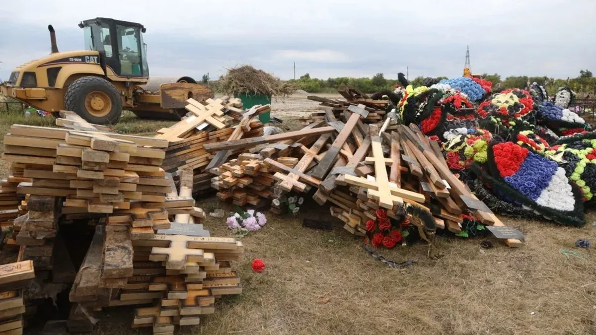До недавнего времени могилы выглядели именно так. Сегодня (и видео это наглядно демонстрирует) кресты с захоронений сняты и уложены штабелями. Надписи на крестах совсем свежие. Те, что удается разглядеть, датированы весной текущего года. Венки просто свалены в кучу.