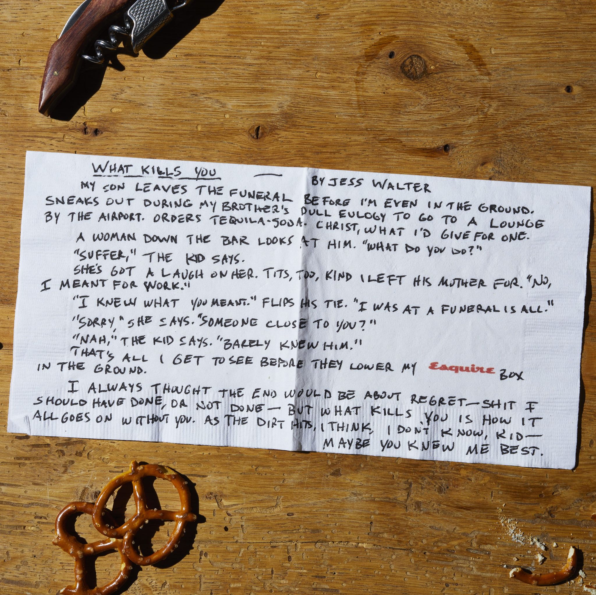 3. В 2007 году журнал Esquire разослал 250 американским писателям 250 бумажных салфеток и попросил написать на этих салфетках рассказы. Откликнулось около 100 авторов — в итоге журнал опубликовал большой Салфеточный проект. Теперь, 16 лет спустя, Esquire решил повторить эксперимент в камерном масштабе: салфеток, авторов и рассказов тут всего по десять. Приятно, что у современных американских прозаиков, за исключением разве что Виктории Шваб, такой разборчивый почерк, а Румаан Алам был даже так любезен, что наклеил на салфетку распечатку.